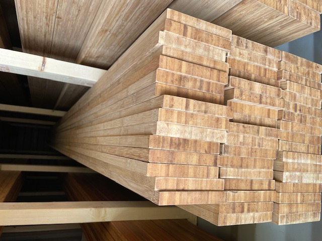 Restpartij hoogwaardige MOSO gelamineerde balken en planken in diverse kopmaten en lengtes.